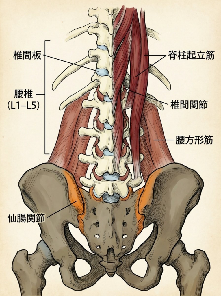 筋筋膜性腰痛は、腰痛全体の約70〜80%を占める最も一般的なタイプです。長時間の不良姿勢、重い物の持ち上げ、運動不足などにより、腰部の筋肉(脊柱起立筋、腰方形筋など)が過度に緊張したり、微細な損傷を起こしたりすることで発症します。