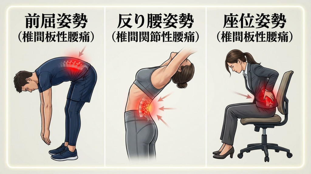 特徴的なのは、前かがみの姿勢(靴下を履く、洗顔など)で痛みが増強することです。また、くしゃみや咳で痛みが走ることもあります。長時間座っていると痛みが悪化し、立って歩くと少し楽になるケースが多く見られます。